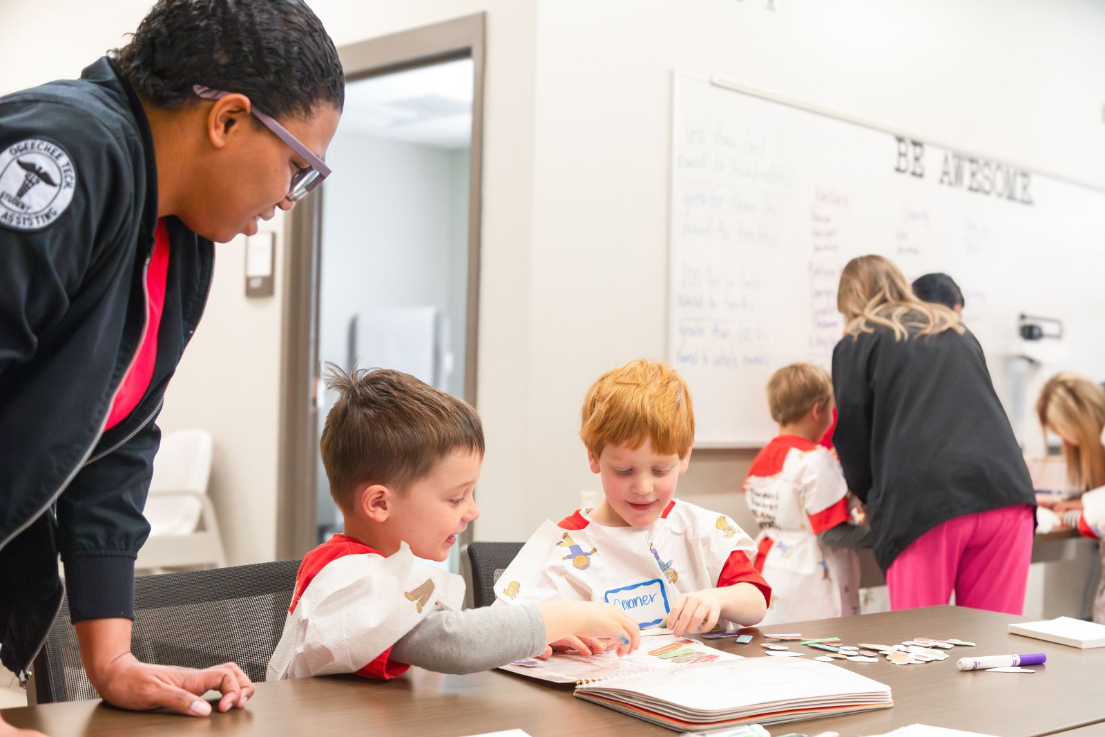 The Medical Assisting program also welcomed the group with hands-on activities focused on basic medical care. The children practiced applying gauze and bandages to stuffed animals, tried on personal protective equipment, and learned how healthcare professionals help keep patients healthy.