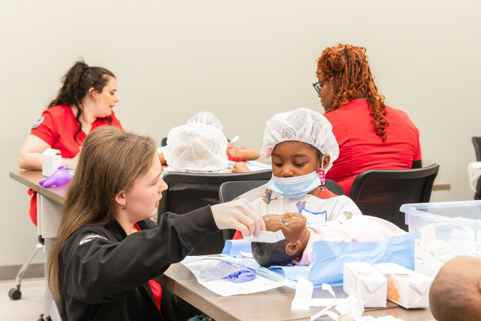 The Medical Assisting program also welcomed the group with hands-on activities focused on basic medical care. The children practiced applying gauze and bandages to stuffed animals, tried on personal protective equipment, and learned how healthcare professionals help keep patients healthy.